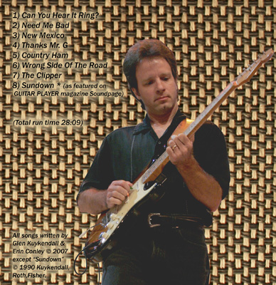 GUITAR 9 CD review: "For his first solo release, Nashville guitarist Glen Kuykendall put together eight all instrumental rock/blues and country numbers which showcase his great chops and liquid tone. Tasty from start to finish, the EP-length Can You Hear It Ring? will energize fans of buttery solos, Vaughan-like riffage, tube-melting overdriven Strats and wicked phrasing. The last track on the CD, "Sundown" was featured on Guitar Player magazine's Soundpage in 1990 - interestingly, the track was a studio out take, recorded when the record button was accidentally pressed during a session. Never short for hyperbole, GP editors wrote "a profoundly musical rocker with a too-good-to-be-true tone." Would that your own accidents were this happy - highly recommended. Instrumental Guitar (Electric/Rock/Country), total running time, 28:09"