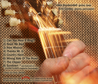 Glen Kuykendall's 1st instrumental guitar CD "Can You Hear It Ring?". Glen is a Nashville based professional studio and live performer regularly performing on the GRAND OLE OPRY, on the road with several professional touring artists, and featured on this CD with drummer extraordinaire Erin Conley. Glen is known on the web on several tech forums under the nick name of "Geetarpicker", and has finally released a CD of original instrumental material in the ROCK, BLUES, and COUNTRY vein. Though he's from Nashville, Glen's style is more heavy and hard rock based than one would typically expect coming from Music City.